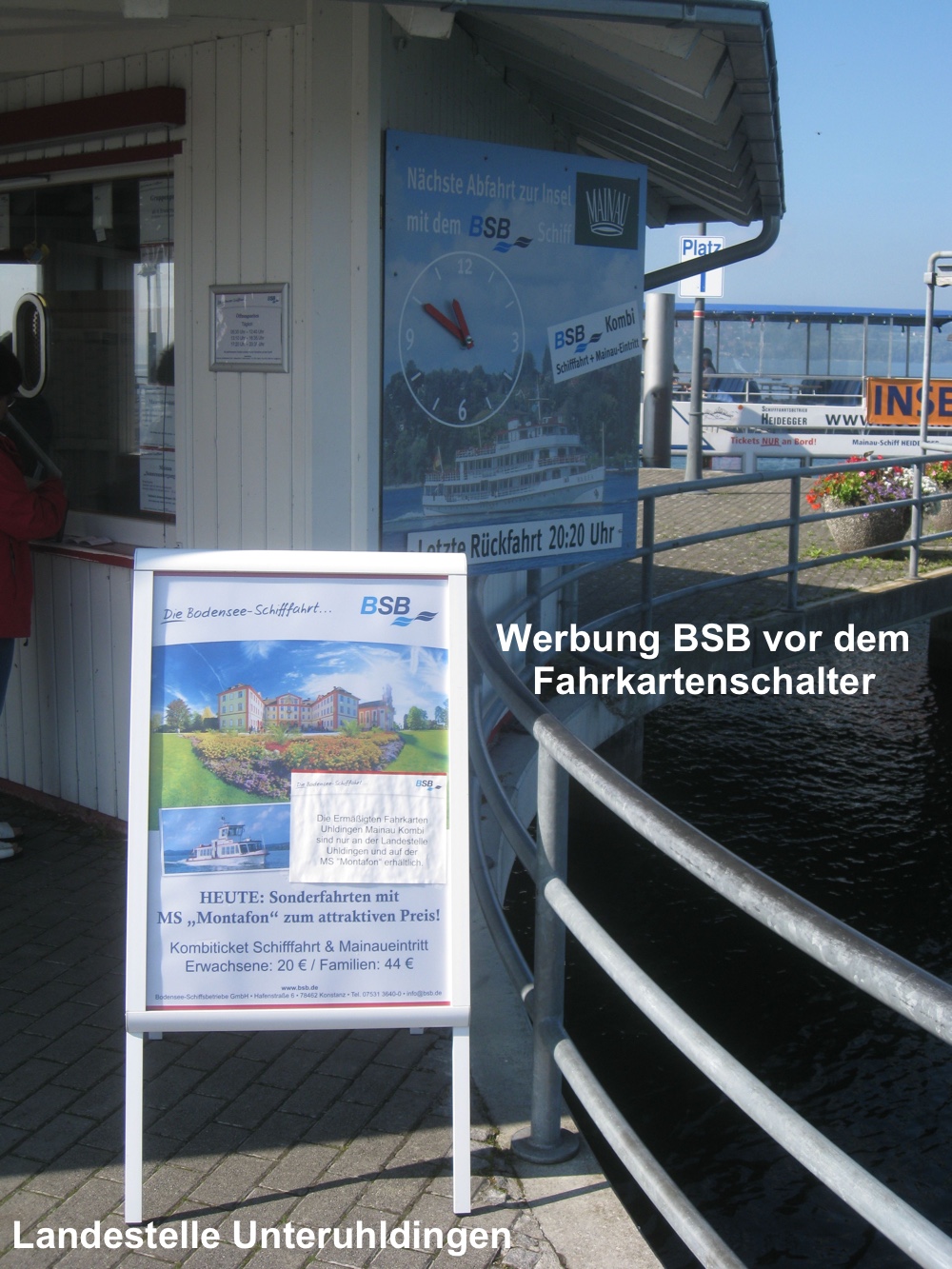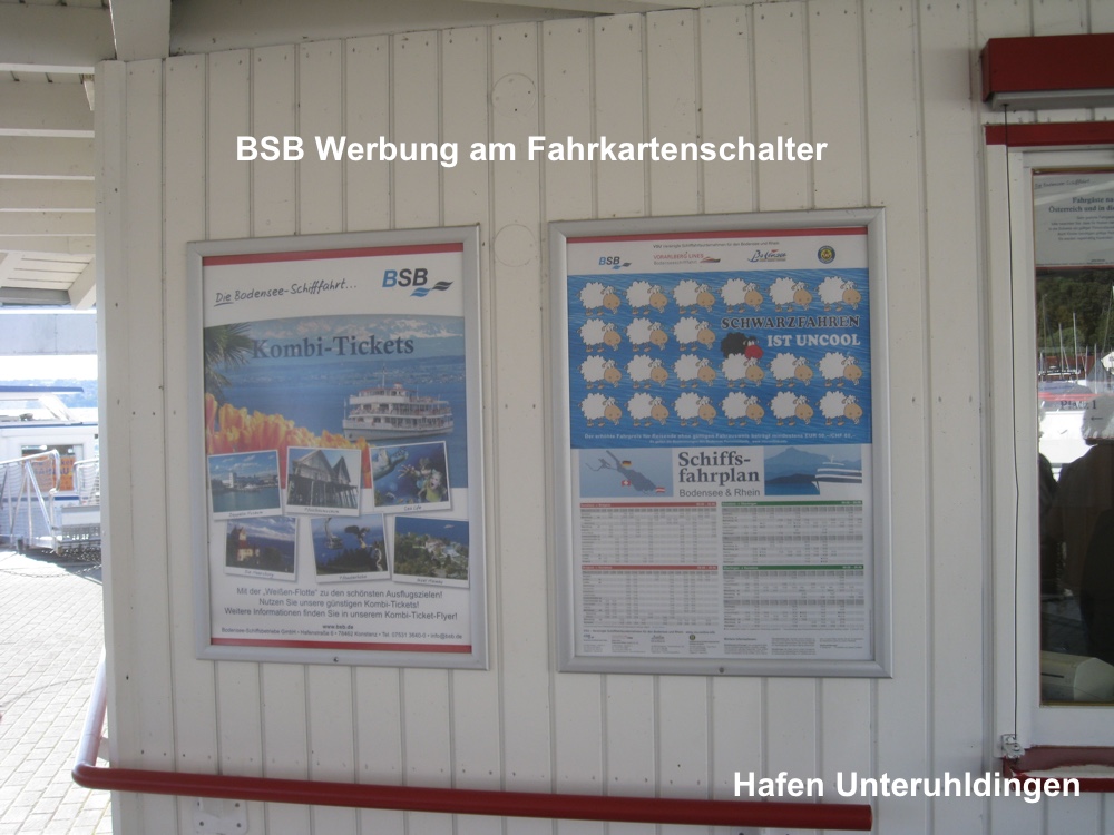BSB-Schalter auf der Hafenmole mit unzähligen Werbeplakaten, Kundenstopper, Prospekten, Abfahrtsuhr: HIER muss HEIDEGGERs Kunde vorbei, ohne sich abwerben zu lassen!