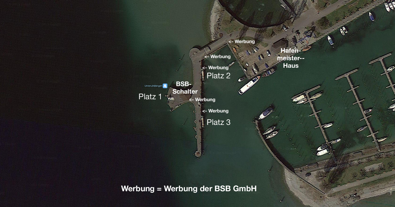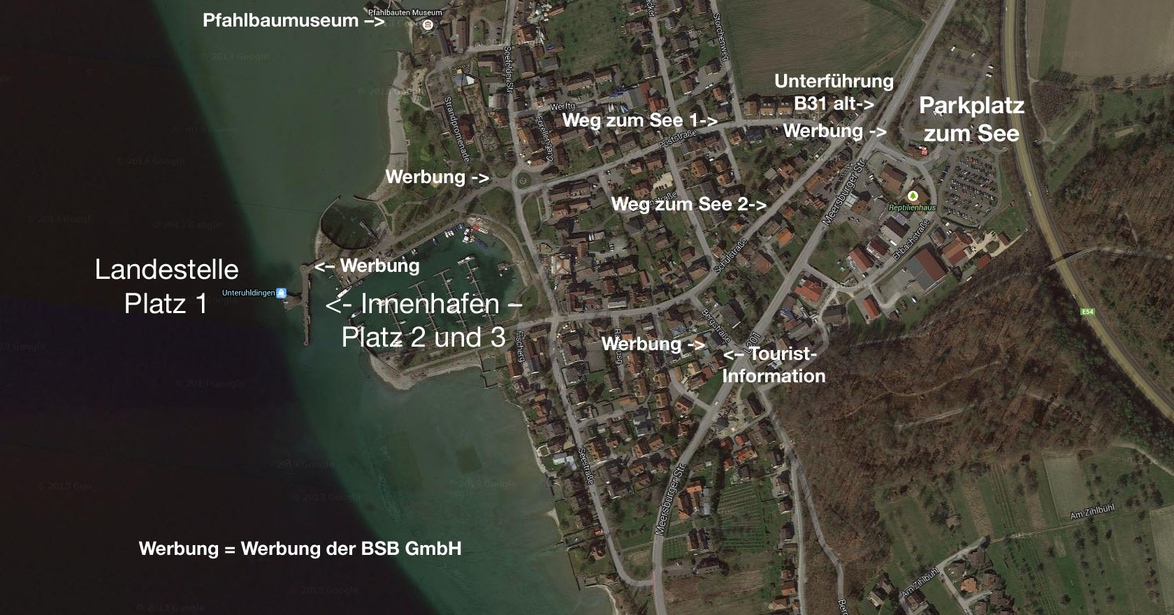 Auf dieser Übersicht sehen Sie die Werbeorte, die der BSB GmbH insgesamt in Unteruhldingen zur Verfügung stehen. Nur in der Tourist-Info und am Hafenmeisterhaus darf HEIDEGGER Werbung machen.